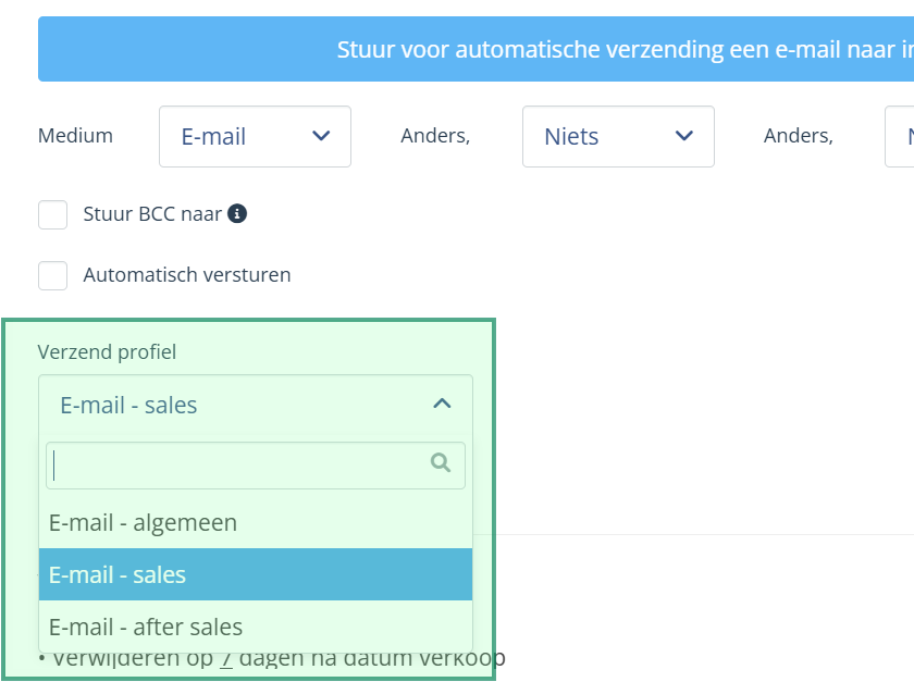 - In het menu ‘verzendprofiel‘ kunt u selecteren vanuit welk profiel het bericht moet worden verzonden: Algemeen, Sales of After Sales