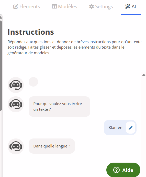 L'onglet AI vous aide à trouver le bon texte pour le message que vous souhaitez envoyer. Il pose des questions pour élaborer un bon message. Il prend en compte le ton de la marque ou de votre entreprise.