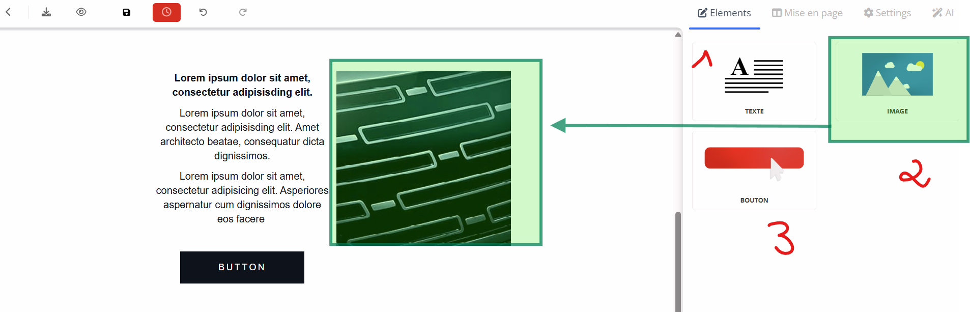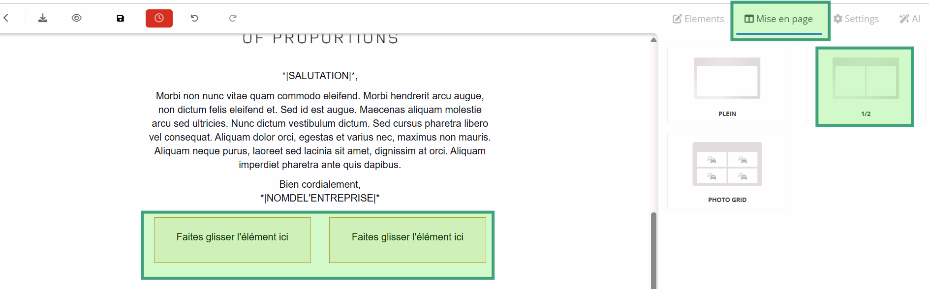 Cliquez sur l'onglet "Mise en page" pour ajouter des éléments au modèle de courrier électronique. En fonction de la marque ou de la charte graphique, vous trouverez ici des éléments de mise en page prédéfinis.