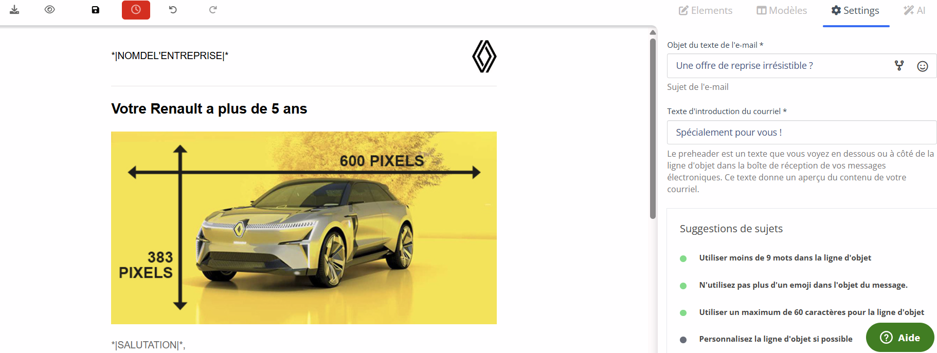 Derrière l'onglet "Settings", vous pouvez notamment définir l'objet et l'en-tête du courriel.